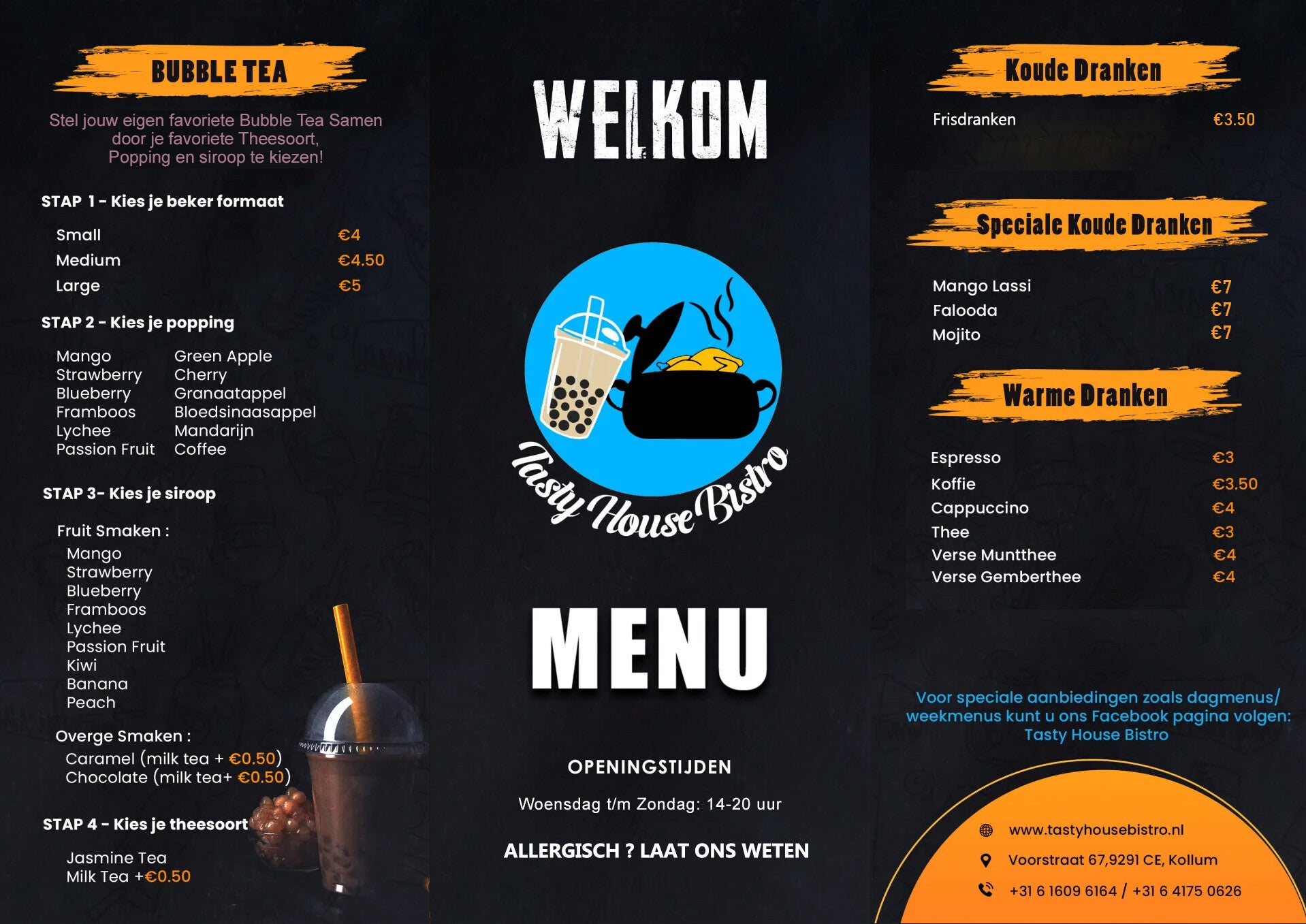 Bij Tasty House Bistro hebben we een smaakvolle selectie samengesteld die de diverse en heerlijke Aziatische keuken vertegenwoordigt. Van hartige voorgerechten tot verrukkelijke hoofdgerechten en kunstig bereide sushi, onze menukaart biedt voor ieder wat wils. Sluit uw maaltijd af met een verfrissende bubble tea.